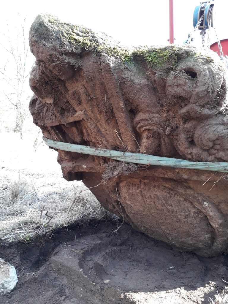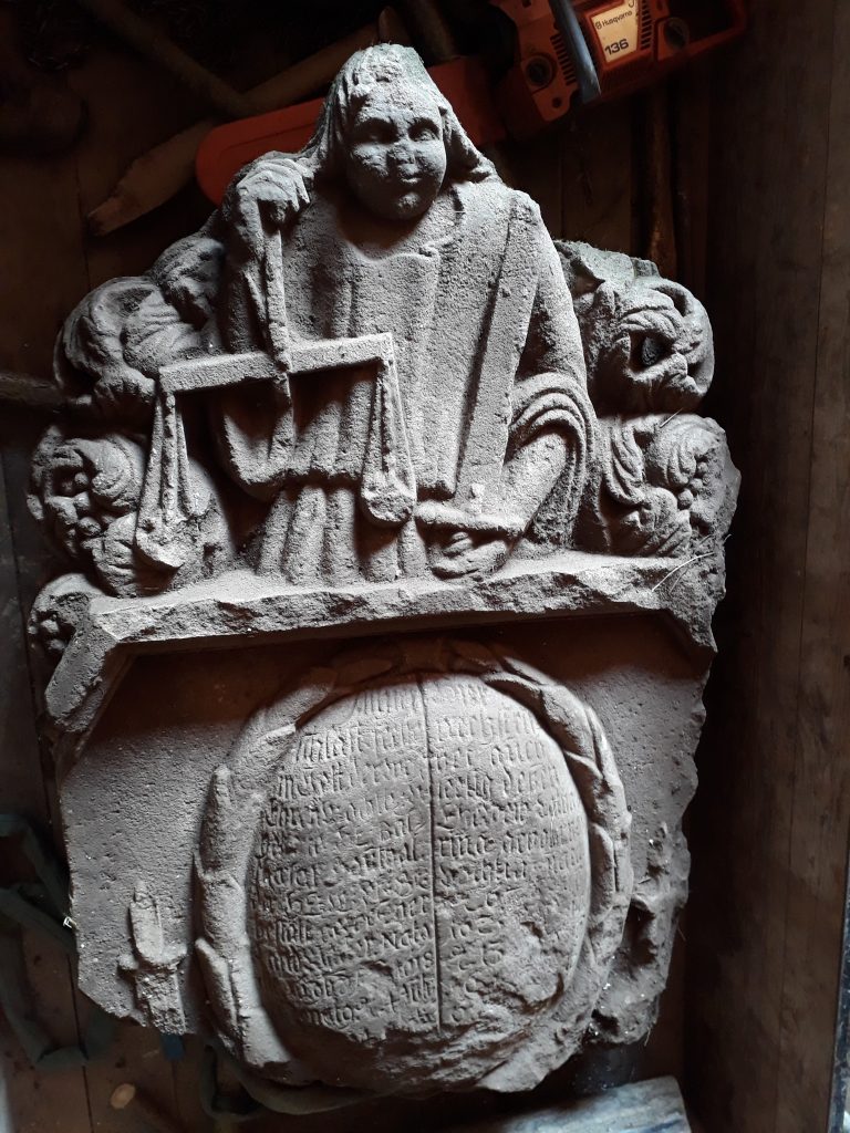 Aus Neugier kehrte sie gleich am nächsten Tag mit Traktor und Unterstützung zum Fundort zurück und barg mit der Seilwinde den Stein, der etwa 1,00 x 1,40 Meter misst. Die Überraschung war groß, als auf der im Erdreich gelegenen Fläche die figürliche Darstellung einer Person mit Waage und Schwert freigelegt war und darunter wiederum ein diesmal mit gemeißelter Schrift versehenes Medaillon erschien.