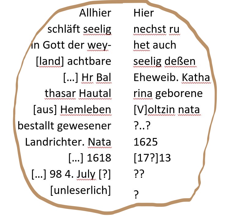 Schnell gesäubert verriet der Stein das Grab des Landrichters Balthasar HAUTHAL nebst dessen Frau und mit seinen Lebensdaten 1618 bis 1696. – Per Google-Suche war schnell eine lange zurückliegende Veröffentlichung von mir gefunden und gleich darauf war die Nachricht in meinem eMail-Postfach.