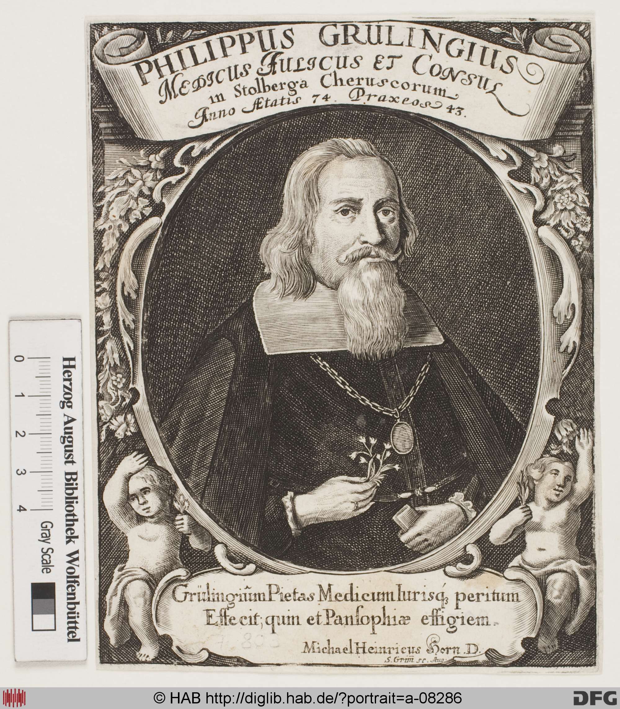 Bild: Gruling, Philipp (aus Stolberg/Harz; Konrektor in Nordhausen; 1627 Rektor in Stolberg; danach Leibarzt, Stadtmedicus und Bürgermeister in Stolberg; Vater des Mediziners Philipp Gerhard Gruling; Mediziner; Rektor; Bürgermeister, 1593-1667). Gefunden in der Datenbank.